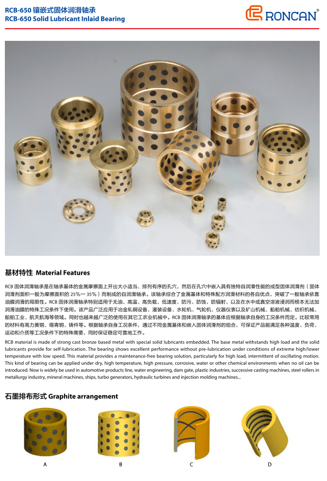 RCB650 является универсальным базовым продуктом, независимо от высокого давления, низкого давления, высокой температуры, низких температур, с масляным смазкой, без масла или с водным смазкой. Все подходит. Основой продукции является высокое содержание меди, что в два раза выше, чем в обычной медной оболочке. Производительность более чем в два раза улучшилась. Таким образом, в металлургической промышленности доступны все литейные, прокатные и конвейерные машины. Также используется в механизмах запирания и выдавливания пластмассовых инжекций. Автопереключатели высокого давления, места для поддержки подъёма строительных машин, а также дуговые двери для гидроузлов. Шкив и место передачи. Также есть бумажные трубопроводы, автомобильная плесень, места, где лодки поднимают якорь и скользятся, и т.д.